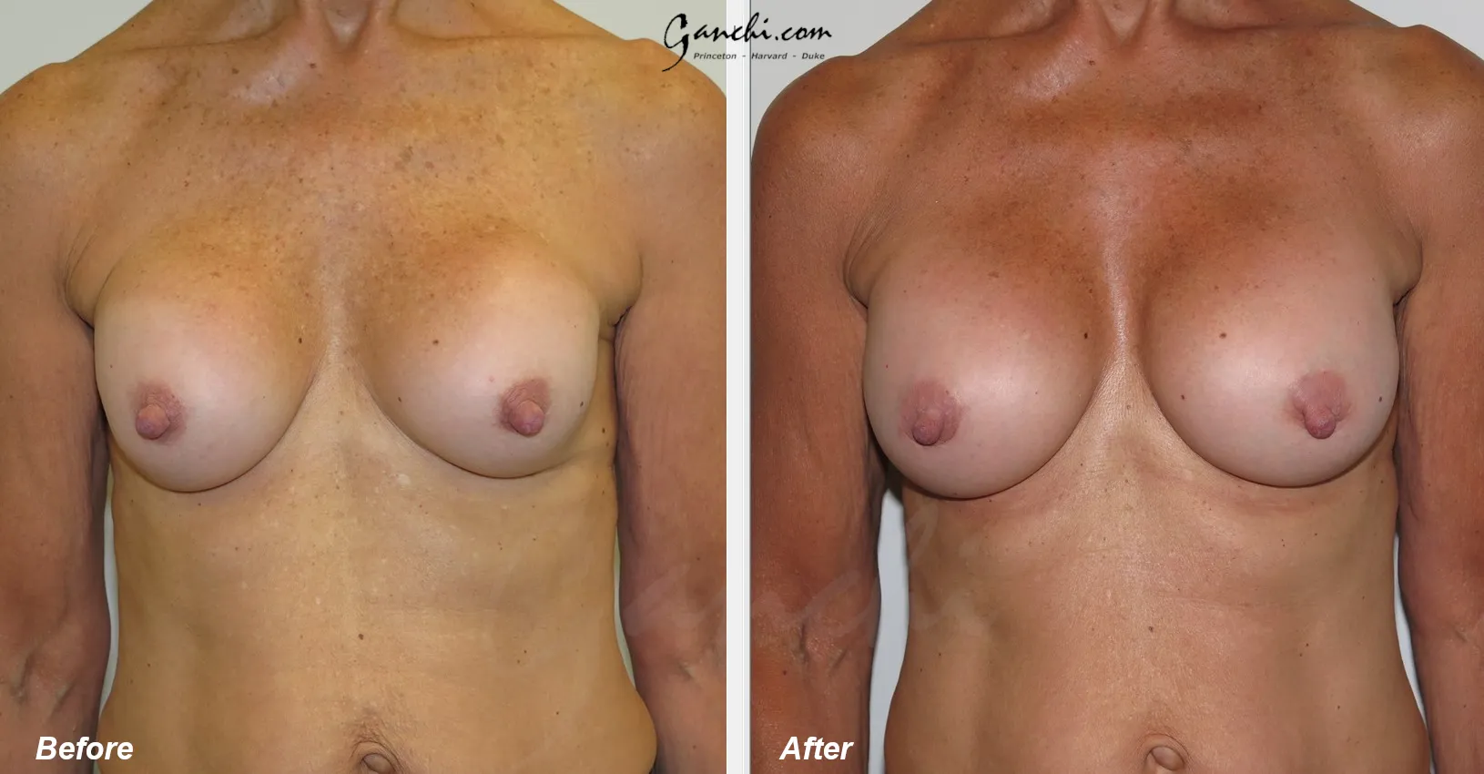This patient had a severe capsular contracture of her breasts. Her breasts were hard, distorted and painful (Baker Grade IV). Dr. Ganchi performed a capsulectomy surgery where the scar tissue around the implants was removed. The implants were replaced with new Allergan Natrelle brand silicone implants.