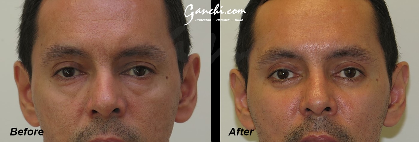 Plastic surgery is not just for women! Patient had puffiness (eyelid bags) which made him look tired. A lower eyelid lift (blepharoplasty) was done to remove the bulges and his own fat was injected to smooth the area for a natural result.