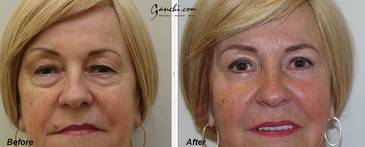 Droopy and puffy eyelids were corrected with an upper and lower blepharoplasty. A fat injection procedure was also done to smooth and fill in the hollows of the lower eyes. This patient now looks years younger!